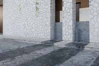 Modern architecture at a hotel in Solidaridad, Mexico. A white building with stairs and an open door, surrounded by lush plants. The urban resort features a solid stone wall and cobblestone floor, creating a luxurious and recreational atmosphere.