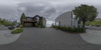 A large residential property with a modern architecture design. The house is surrounded by an open space, with a parking lot and a brick walkway. Cars are parked in front, adding to the urban design of the neighborhood.