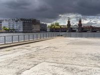 This stock photo showcases the modern architecture in Berlin, Germany. The image features a body of water near some buildings, with people sitting on a bench in front of it. The open space and the city skyline create a breathtaking view. The photo was taken during the day, capturing the beautiful tree-lined plaza and the cloud-filled horizon. The road surface, fence, and high-rise buildings add to the urban atmosphere. The photo also highlights the cityscape, with tall towers, office buildings, and a bank visible. This image represents the bustling business district of Berlin, a cosmopolitan city in Europe known for its innovative architecture and vibrant public spaces.