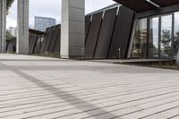 This stock photo showcases a magnificent building in Toronto, Ontario. The modern architecture features a stunning facade with a contemporary design. The building is framed by a walkway and columns, which lead to the entrance. The surrounding open space provides a welcoming atmosphere. The wood flooring and siding add warmth and richness to the environment. The cloud-dotted sky creates a beautiful backdrop. This image is perfect for illustrating real estate, urban development, and property concepts.
