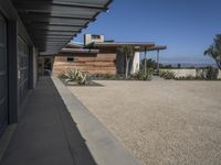 This stock photo showcases a modern architecture in Los Angeles, California, USA. The building is made of concrete and surrounded by a beautiful landscape with mountains and a clear blue sky in the background. The sidewalk to the right leads to a residential area with green grass and trees. This property is a perfect example of contemporary residential design in a suburban setting.