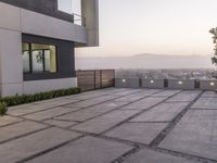 A modern residential villa in Los Angeles, California. The low concrete building features a large courtyard with a seating area and a wood fence. Clear skies enhance the sleek lines of the architecture.