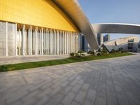 This stunning image showcases a modern architecture building located in a bustling metropolitan area. The building features multiple curved sections on each side, with grass beautifully integrated between them. The sleek facade, made of composite materials, gives it a futuristic and urban design. The structure stands tall against the cityscape, offering a glimpse into the vibrant city life. This mixed-use building serves as an office building, museum, and business district, making it a prominent fixture in the city's architectural scene. With its innovative design and concrete surfaces, this architectural masterpiece is a true representation of urban sophistication.