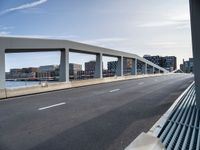 A view of a modern cityscape in the Netherlands. The image features a busy business district with office buildings and a network of roads and bridges. The city is surrounded by a clear sky and has a pier overlooking the harbor.