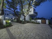A modern residential area in Shanghai, China. The stone paver patio is illuminated by artificial lights, highlighting the beautiful architecture of the houses and the surrounding trees. A serene and elegant neighborhood at night.