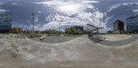 A modern architecture office building in the business district of Barcelona, Spain. The city's urban design features open spaces and plazas with concrete surfaces. Cloudy day adds to the city life vibe.
