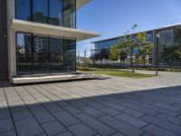 A modern office building in Lisbon, Portugal. The architectural design features sleek lines and a combination of shadow and sunlight. The city's urban design creates a vibrant open space that blends business districts with natural vegetation. A perfect representation of city life in Europe.