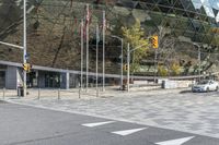 This stock photo showcases modern architecture in Ottawa, Canada. The image features a cityscape with a clear sky, office buildings, and a futuristic architecture design. The scene includes some cars stopped at a stoplight, with multiple arrows on the road. The road surface is made of asphalt, and there are trees and vegetation along the thoroughfare. The glass walls of the buildings reflect the urban design and the business district ambiance. Overall, this image captures the urban life and infrastructure of Ottawa, portraying a blend of modern architecture and city elements.