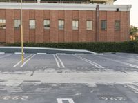Modern architecture and concrete streets dominate the cityscape of Los Angeles. The grey parking lots with white and red markings contrast with the surrounding buildings and landscaping. A captivating dawn scene in the urban jungle of California.