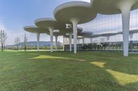 A modern architecture pavilion set amidst a lush green lawn in Suzhou. The clear sky provides a perfect backdrop for this futuristic structure. The urban design blends seamlessly into the surrounding urban landscape.