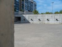A modern architecture plaza in Zaragoza, Spain. The concrete walls create an urban design and serve as a backdrop to the open space. Clouds fill the sky above, adding depth to the foreground.