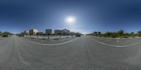 a 360 - angle photograph of a sunny day in front of city streets and a street