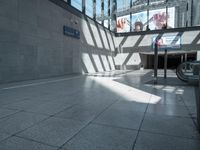 Modern architecture at Potsdamer Platz in Berlin, Germany. An empty hallway with light streaming in through the entrance. The ground is lined with concrete flooring, leading to escalators on either side. A snapshot of urban design in Europe's vibrant city life.