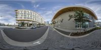 three circular panoramas show a parking lot and buildings with modern design and unique architecture