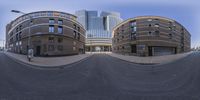 A wide angle view of two circular buildings with curved driveways and parking lots near the street. The modern architecture of the buildings stands out in the residential area. The surrounding trees add a touch of nature to the urban landscape.