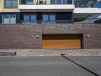 Modern architecture in the residential area of Bremen, Germany. Yellow garage door stands out against the brick wall. Urban design blends with clear sky. A snapshot of city life in Europe.
