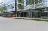 This stock photo showcases a modern architecture building in the bustling city of Shanghai, China. The glass building features a sleek facade and is surrounded by tables, chairs, and a bench in the park area next to it. The mixed-use building serves as both office space and a public space, providing a vibrant and urban design. The photo captures the energy of city life in the metropolitan area, showcasing the contemporary and stylish atmosphere of Shanghai's business district.