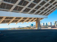 This stunning image captures a modern architectural marvel in Barcelona, Spain. A building made out of solar panels stands tall in front of the crystal-clear ocean and a vibrant blue sky. The solar panels not only provide shade and infrastructure but also contribute to sustainable energy production. The high-rise design and urban layout of the building add to the overall charm of the cityscape. Barcelona's scenic coastal landscape, along with the nearby pier and jetty, further enhance the beauty of this architectural gem. The combination of nature, modern architecture, and clear skies makes this image a perfect representation of Barcelona's architectural prowess and its harmonious blend with the surrounding environment.