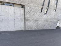 Modern architecture in Spain showcased through concrete walls and asphalt surfaces. A skater explores the urban landscape, surrounded by trees. The building resembles a museum, representing the material property of Tenerife's architecture.
