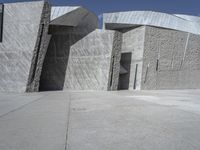 A striking example of Brutalist architecture in Spain, showcasing a modern and futuristic design. The building made of concrete and composite materials stands tall against a clear sky. The white walls and shadow play create an intriguing visual composition.