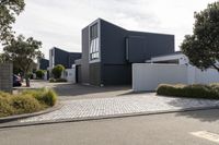 This is an image of a modern residential villa in Wellington, New Zealand. The villa features a sleek and contemporary design, with a grey sky in the background. The driveway, made of smooth asphalt, leads to the entry of the home. The architectural elements of the villa complement the suburban surroundings. This photo represents a typical day in Wellington, with clouds in the sky. The image showcases the blend of modern architecture and the natural beauty of New Zealand.