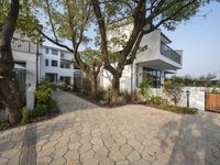 This is an image of a modern residential building in a suburban neighborhood in Shanghai, China. The house features a contemporary design with large windows that provide ample natural light. The property is surrounded by lush vegetation and trees, creating a peaceful and serene atmosphere. The driveway leads up to the entry of the house, offering a welcoming entrance to the home. The clear sky accentuates the clean lines and sleek surfaces of the architecture. This photo represents the beauty of modern residential living in the bustling city of Shanghai.