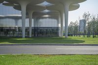 A modern architectural masterpiece set in the bustling city of Suzhou. The building stands tall against a clear sky, surrounded by a lush green lawn and flowers. This urban oasis is a perfect blend of nature and urban design.