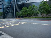 This is an image of a parking lot in Taipei City, Taiwan. The modern architecture of the building stands out against the clear sky, representing the futuristic design of the city. Lined with trees, the asphalt road and composite material sidewalk showcase the urban design of Taipei. This residential area showcases the blend of nature and city life that can be found in Taiwan. The photo captures a typical day in the bustling city, showcasing the urban landscape and the vibrant energy of Taipei.