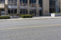 A modern office building in Toronto's business district. The sleek facade and large windows showcase the city's modern architecture. The surrounding urban landscape features stone walls, curbs, and a busy road.