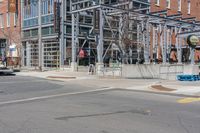 This image showcases the modern and vibrant architecture of a residential neighborhood in Toronto, Canada. The city comes alive during the day with cars driving on the asphalt roads. The tall buildings with numerous windows add to the urban design of the area. A tunnel and crosswalk provide safe pedestrian access across the city streets. The condos and residential areas are connected by driveways and thoroughfares, with curbs and entry points clearly visible. This photo captures the bustling city life and showcases Toronto's unique urban landscape.