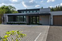 This stock photo showcases modern architecture in Toronto, Canada. The image features the front entrance to the presentation gallery, with a contemporary building on the right side. A tree adds a touch of greenery in the center. The property is located in a residential area, surrounded by a well-maintained parking lot and asphalt road surface. The large windows provide ample natural light and views of the surrounding vegetation. The scene is set during the day, with clouds in the sky. The building's door and shade give it an inviting touch. The whole composition showcases a stunning villa-like structure, suitable for various purposes like a home, museum, or office building. This visual can be used for illustrations related to business, architecture, real estate, and urban development in Toronto's bustling business district.