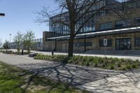 A view of a modern office building in Toronto's business district. The clear sky contrasts with the urban landscape of brownstone buildings and tree-lined streets. The architecture showcases Toronto's urban design and art district.