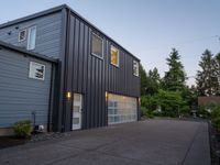 Modern residential villa in California, with a clear sky and the first light of dawn breaking. The empty garage, visible through the windows, signifies the start of a new day.