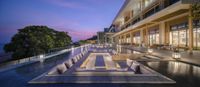 an outdoor pool is lit up at dusk overlooking a resort with large balconies on the edge
