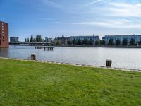 This stock photo showcases a stunning cityscape with modern architecture and water resources. The image features a pier and a harbor in Holland, Netherlands, with a river flowing through it. The sky is filled with fluffy clouds, creating a picturesque scene. The city is surrounded by lush vegetation and grass surfaces, providing a harmonious blend of nature and urban design. The buildings exhibit classic and modern architecture, adding to the charm of the city. This photo captures the essence of city life in Europe, with open spaces and a serene water landscape.