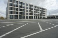 This photo showcases the modern architecture and cityscape of Berlin, Germany. The image captures a view of a beautiful office building with a glass facade, located in the bustling business district. The building stands tall against the clear blue sky, accompanied by scattered clouds. The city's well-designed road system, including the lane and asphalt, lead to the building's entrance and the surrounding parking lot. In the background, an airplane is seen flying in the sky, which could symbolize the city's international connectivity through its airport. This image represents the urban and metropolitan essence of Berlin, as well as its strong presence in the business and transportation sectors.