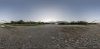 a fish eye view of a street near the city of minneapolis, with a bridge across it