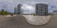 two buildings are seen in this fish - eye lens picture with a man standing on the sidewalk