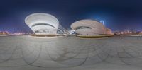A futuristic white building with circular shapes, illuminated at night, stands against a clear night sky. The modern architecture creates a striking cityscape. The open space and concrete street add to the urban vibe.