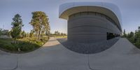 A modern high-rise building in a metropolitan area, with a parking lot in front. The fish-eye lens shot captures the dynamic urban design. Clear sky provides ample sunlight for the concrete and glass facade.