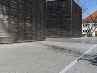A modern building in an urban city in Germany. The architecture is characterized by rectangular shapes and wooden accents. The property features open spaces and shaded areas. The grey asphalt road surfaces and wooden walls contribute to the urban design of the area.