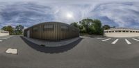 the reflection of a building with a parking lot on it, seen from a fish eye lens