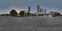 A modern city park in Guangzhou, with a skate park in the center. The futuristic architecture of the surrounding buildings creates a stunning cityscape. The park's open spaces and grassy areas provide a natural environment in the heart of the bustling business district.