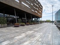 the view of a modern looking city sidewalk and outside seating area with flowers in the center