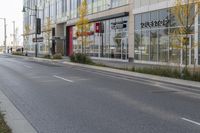 An empty street in the heart of Toronto's business district. Modern architecture dominates the skyline, with office buildings and storefronts lining the urban thoroughfare. Trees provide a touch of green amidst the concrete jungle.