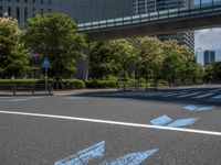 A modern cityscape with a bridge and underpass. Hard shadows cast on the asphalt road. Urban design at its finest with modern architecture. The city comes alive in the day with its vibrant urban life.