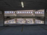 A modern cityscape with clear skies and open spaces. The concrete and asphalt architecture of this urban environment offers a sunny backdrop to the city life. The parking deck and office buildings showcase modern design.