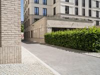 A modern condominium building in Berlin, Germany. The sleek architecture and clean lines contrast with the cobblestone road and surrounding vegetation. A perfect representation of city life in Europe.