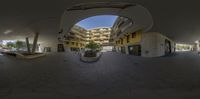 A fisheye panoramic view of a parking garage in a modern European city. Clear sky and straight roads highlight the urban architecture. Residential areas and cobblestone streets add charm to the cityscape.