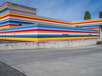 A modern factory in Berlin, Europe showcasing industrial architecture against a clear sky. Multicolored surfaces and urban vegetation create a vibrant urban landscape. The parking lot hints at a busy day of manufacturing work.